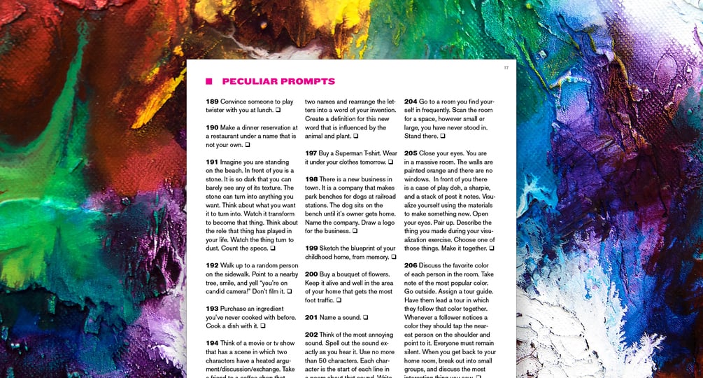 Looking for a mindful way to spark your creativity? Need an excuse to get a little weird? Peculiar Prompts is for you. This download includes a collection of 1,003 creative prompts designed to break the rhythm of an otherwise mundane business meeting, weekday, or general existence.