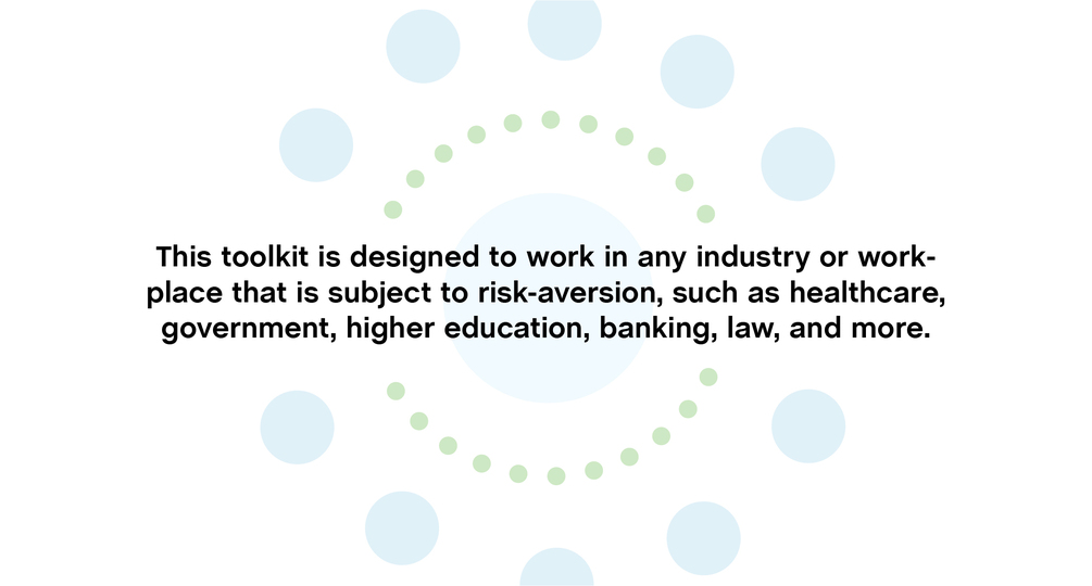 The Risky Business Toolkit is designed to be completed in ~3 hours, and is broken into two parts: First, we provide a methodology for innovators to use in risk-averse environments to generate creative ideas. Second, we provide a framework for innovators to get buy-in on their ideas.