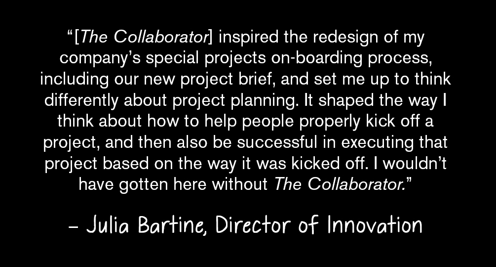 “[The Collaborator] inspired the redesign of my company’s special projects on-boarding process, including our new project brief, and set me up to think differently about project planning. It shaped the way I think about how to help people properly kick off a project, and then also be successful in executing that project based on the way it was kicked off. I wouldn’t have gotten here without The Collaborator.” - Julia Bartine, Director of Innovation